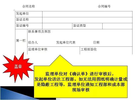 2、監(jiān)理單位對《確認單》進行審核后,發(fā)起單位送達項目公司工程部。如無法用圖紙明確計量或是隱蔽工程等,監(jiān)理單位通知工程部和成本部現(xiàn)場審核。