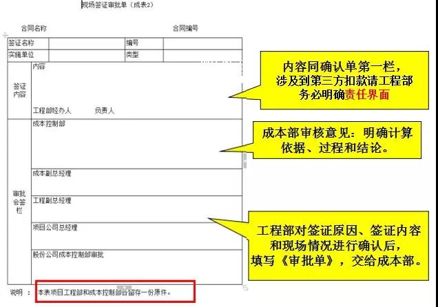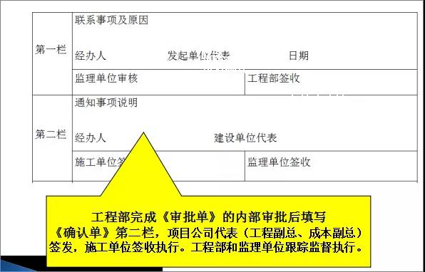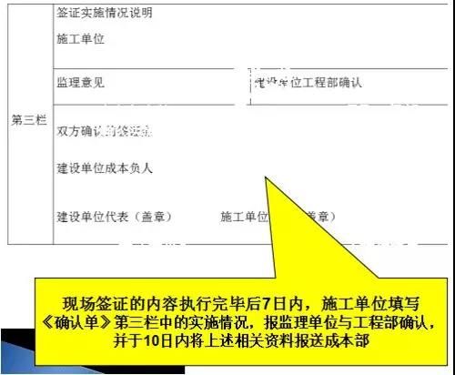 3、工程部對簽證原因、簽證內(nèi)容和現(xiàn)場情況進行審核確認后,填寫《確認單》第二欄,項目公司代表(工程副總、成本副總)簽發(fā),施工單位簽收執(zhí)行。工程部和監(jiān)理單位跟蹤監(jiān)督執(zhí)行。